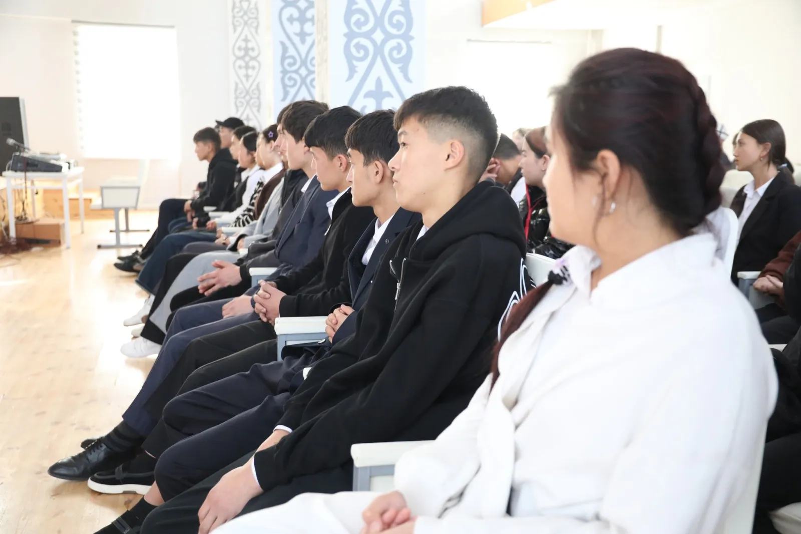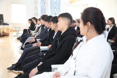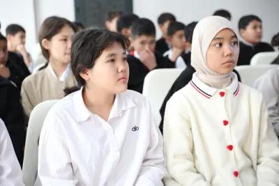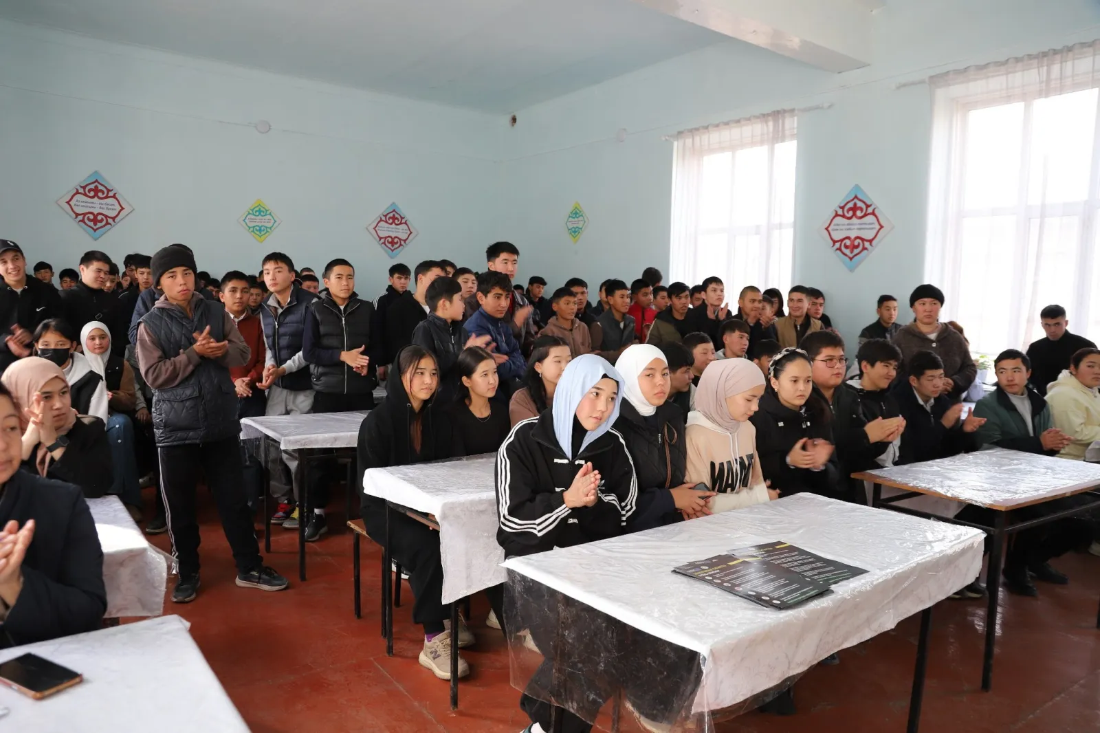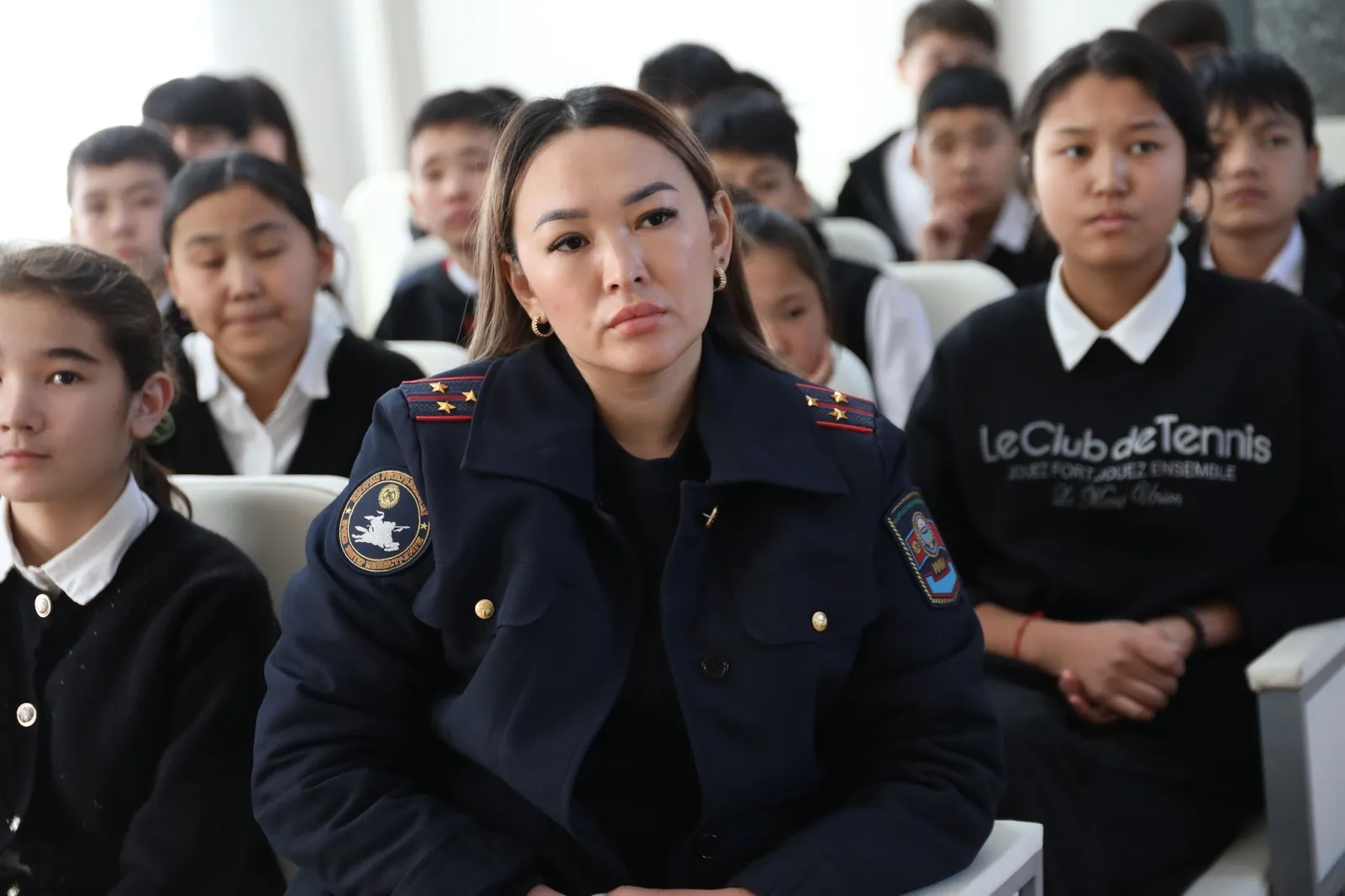Жолугушууда окуучуларга жана студенттерге эрте турмуш курууну терс кесепеттери жана кылмыш жасагандарга берилүүчү жазалар туурасында маалыматтар берилүүдө.